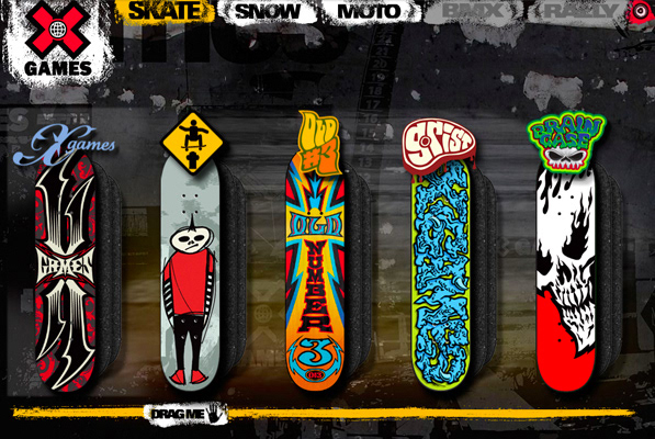 To slap you upside the melon and to bring forth yet more brand personality of the X GAMES was our mission in developing our 2nd year of product artwork for their licensee. Dave Parmley and Eric Ruffing, formerly with 13THFLOOR, were responsible for over 120 unique works of art and graphics for the X GAMES product line, including Deck Line groups Logos, Decks, Shoes and Moto-X toy designs.